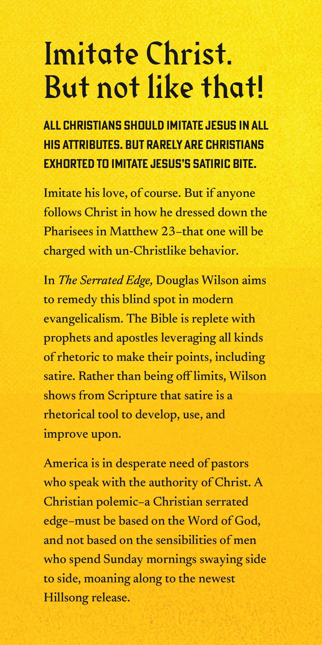 In The Serrated Edge, Douglas Wilson aims to remedy this blind spot in modern evangelicalism. The Bible is replete with prophets and apostles leveraging all kinds of rhetoric to make their points, including satire. Rather than being off limits, Wilson shows from Scripture that satire is a rhetorical tool to develop, use, and improve upon.